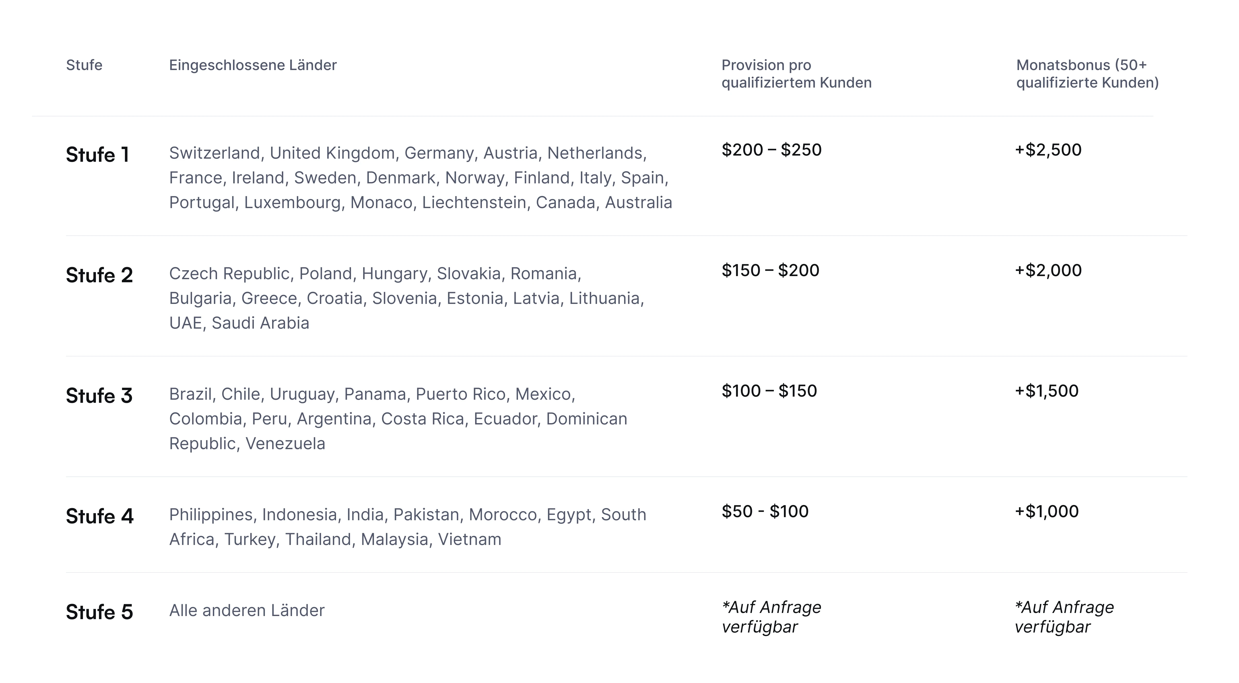 Ihre Einnahmen steigen mit Ihrem Publikum. Sehen Sie sich alle Provisionssätze und monatlichen Bonusmöglichkeiten in einer einfachen Struktur an.